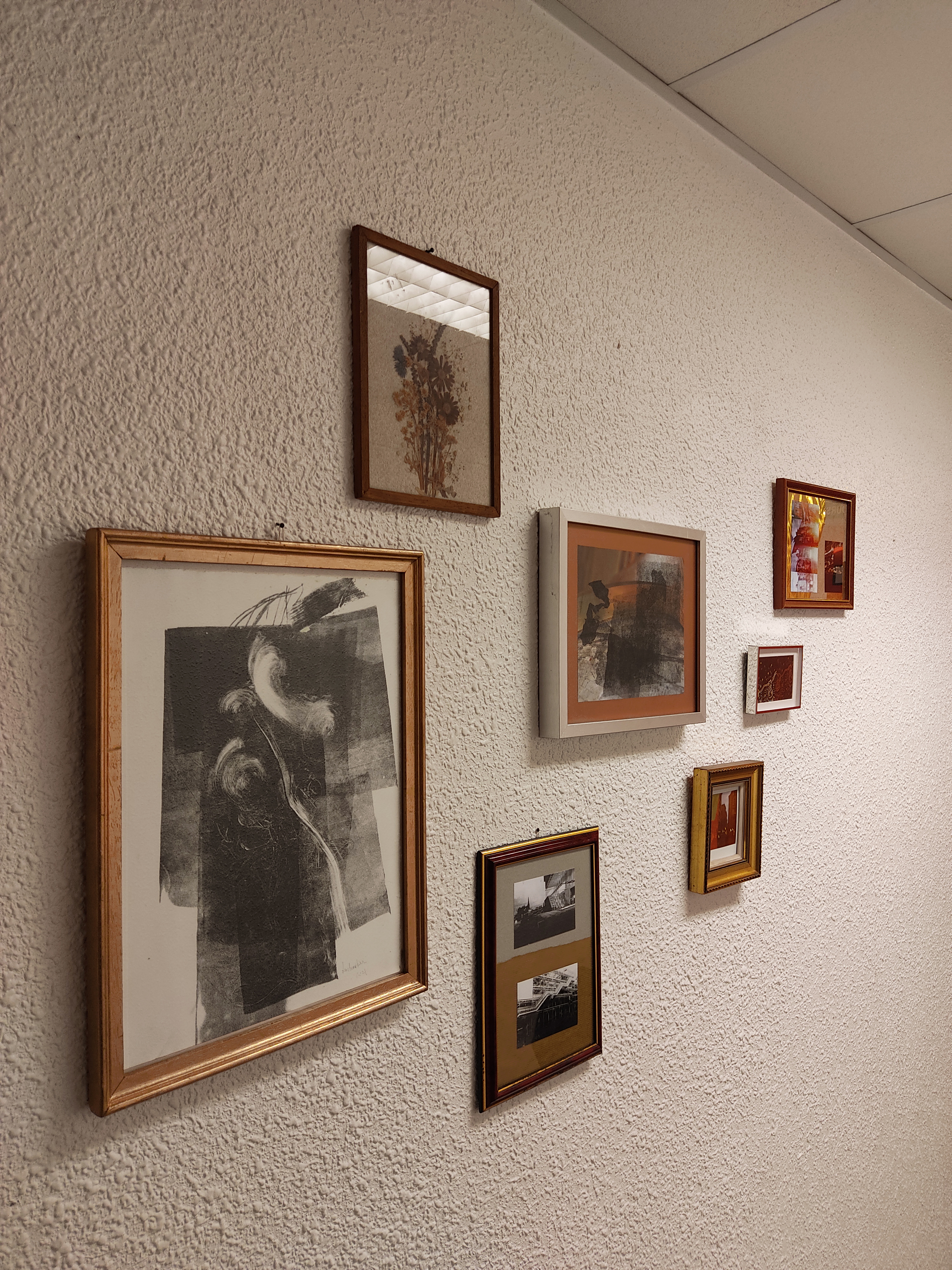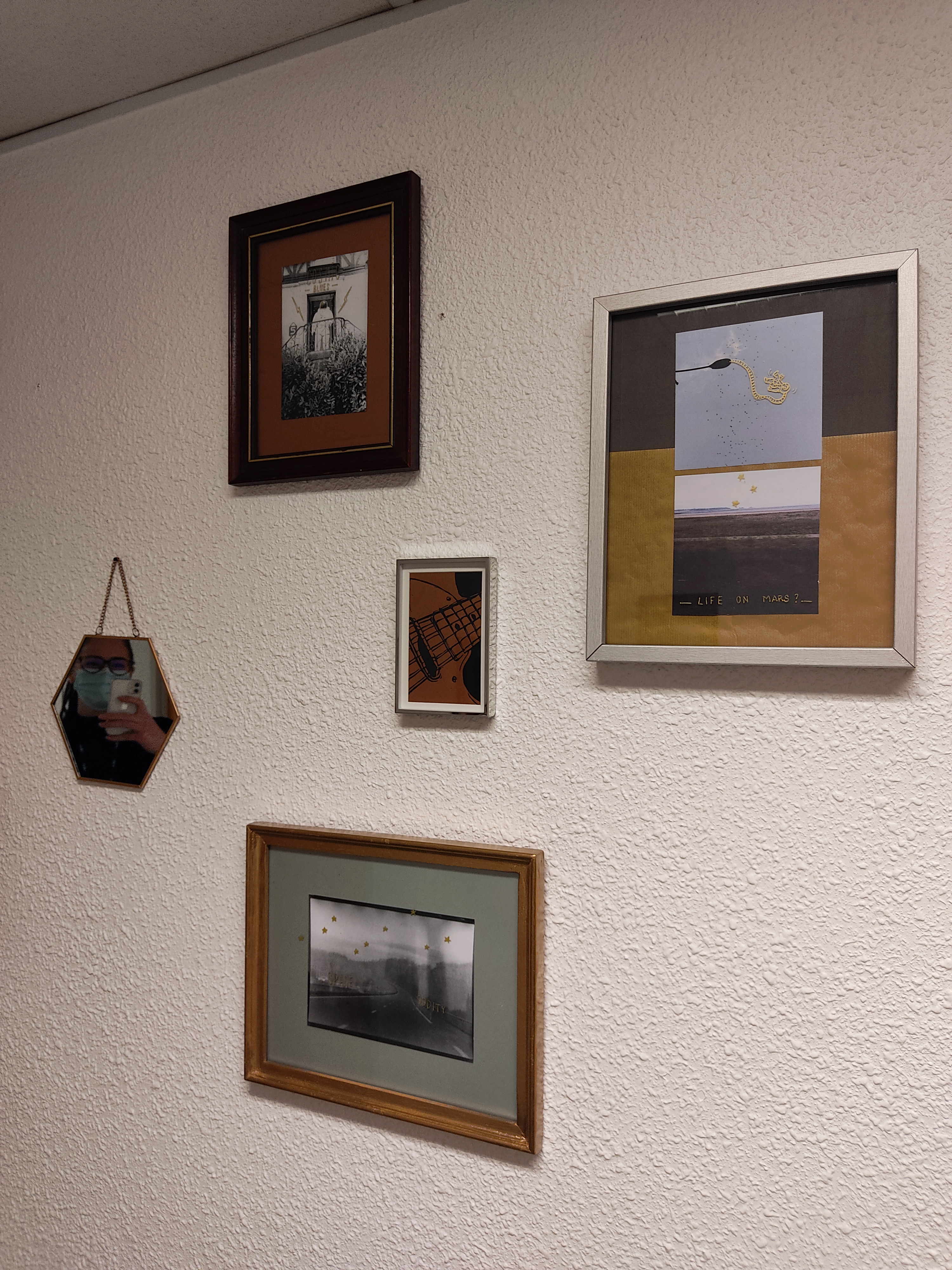En collaboration avec les artistes Maria Luchankina, Zoé Métreau et Vie de poche, nous avons sélectionné des travaux résonnant avec la thématique de l’artiste en tournée. Nous avons réinvesti des images de voyages, des gravures sur des thématiques musicales, et des photographies capturées en lien avec la question de la lumière, de l’éclairage ou encore de la déambulation. Nous avons ensuite découpé, assemblé ou juxtaposé ces dernières dans un ensemble de cadres éclectiques. Des constellations de ces travaux sont visibles sur différents couloirs du bâtiment, laissant les productions interagir entre elles, à l’image des artistes du spectacle en cheminement, tant physiquement que dans leur processus créatif.