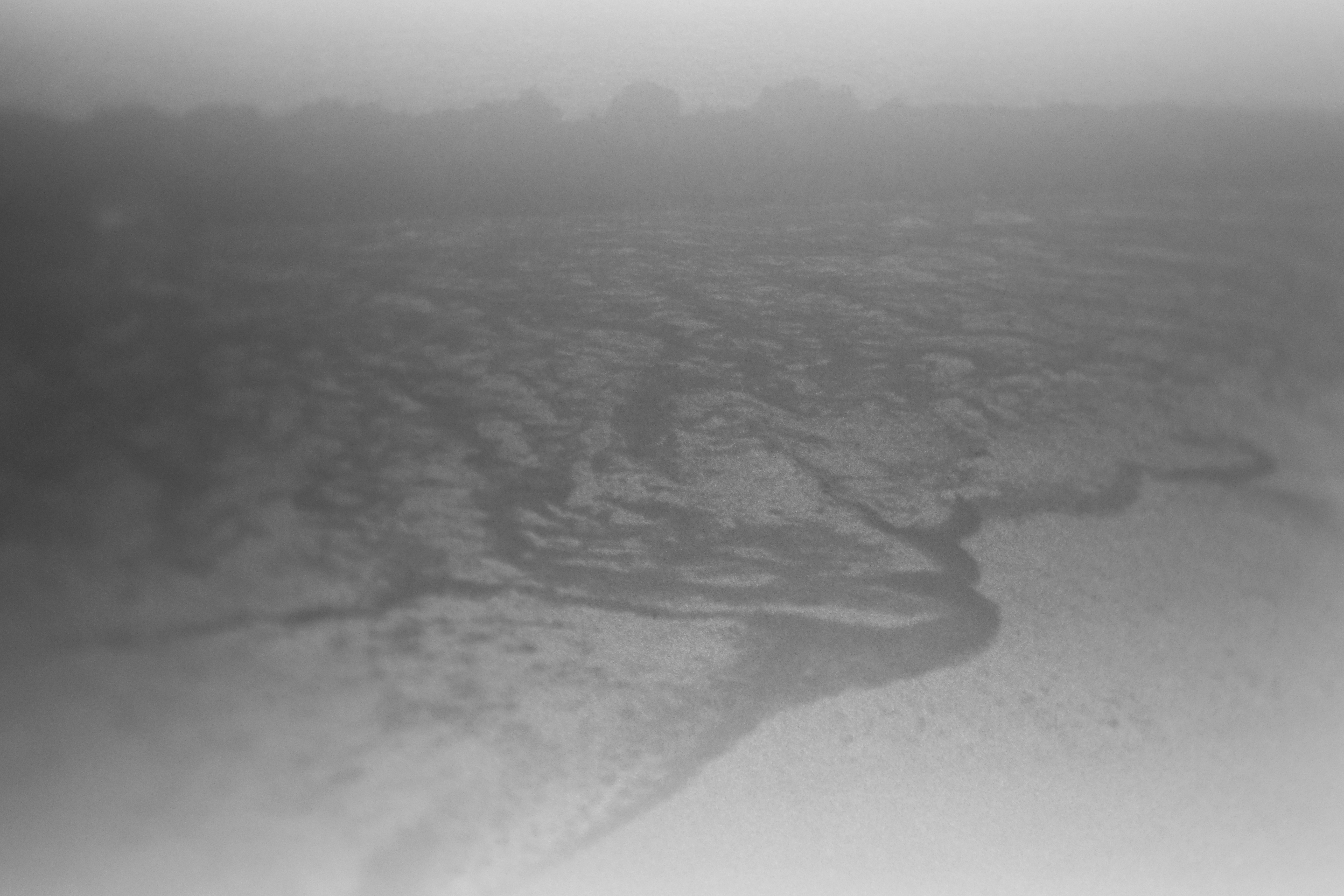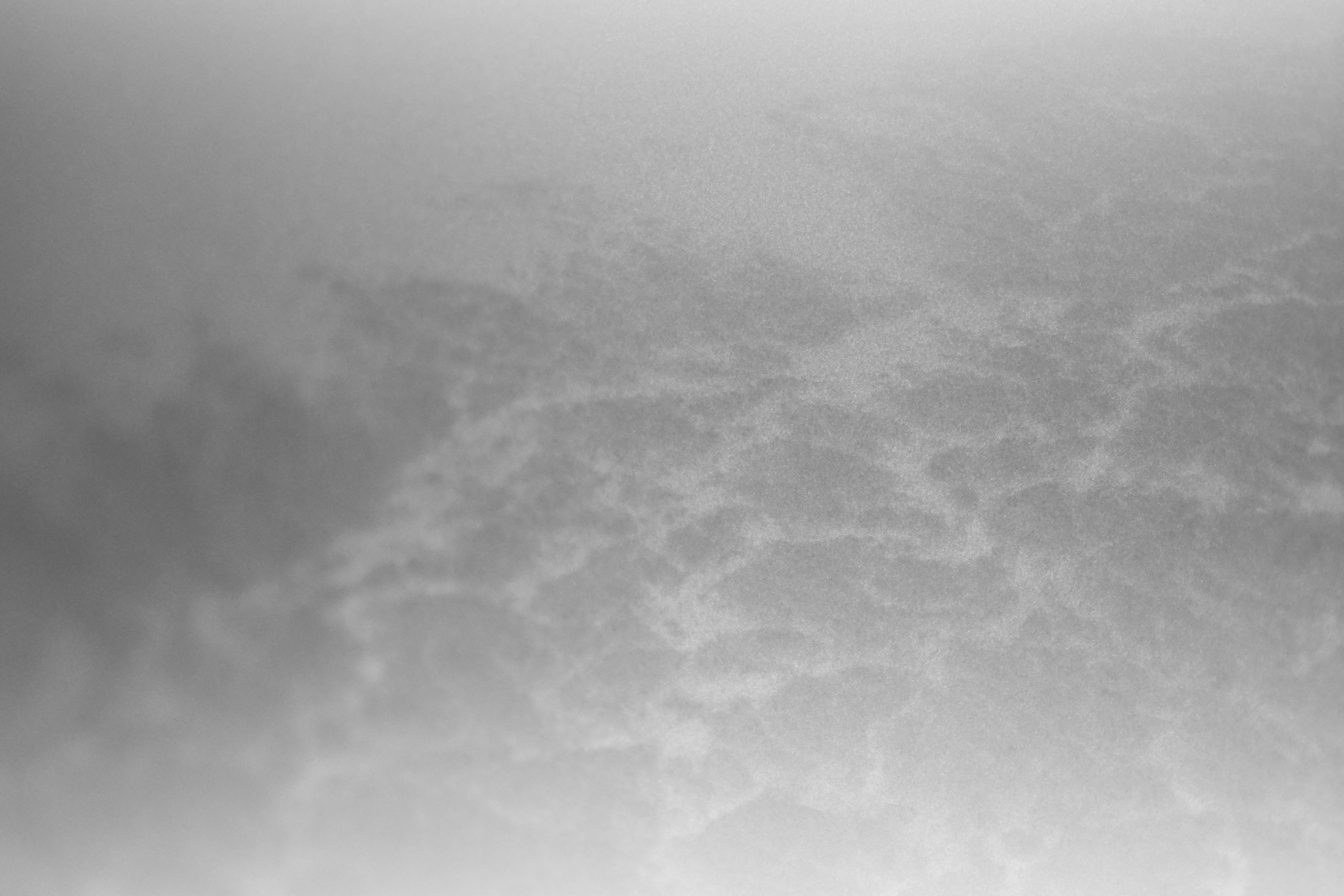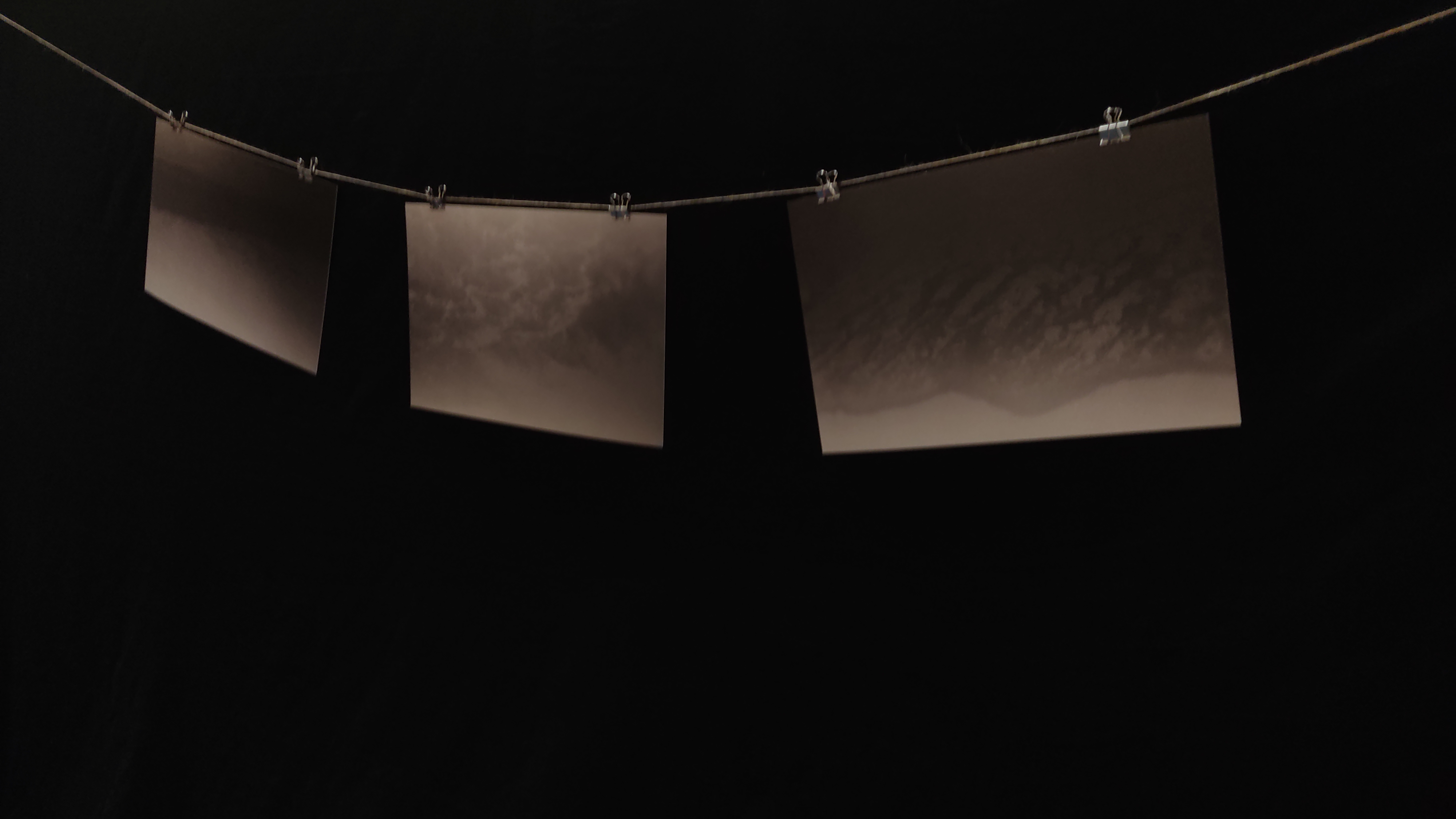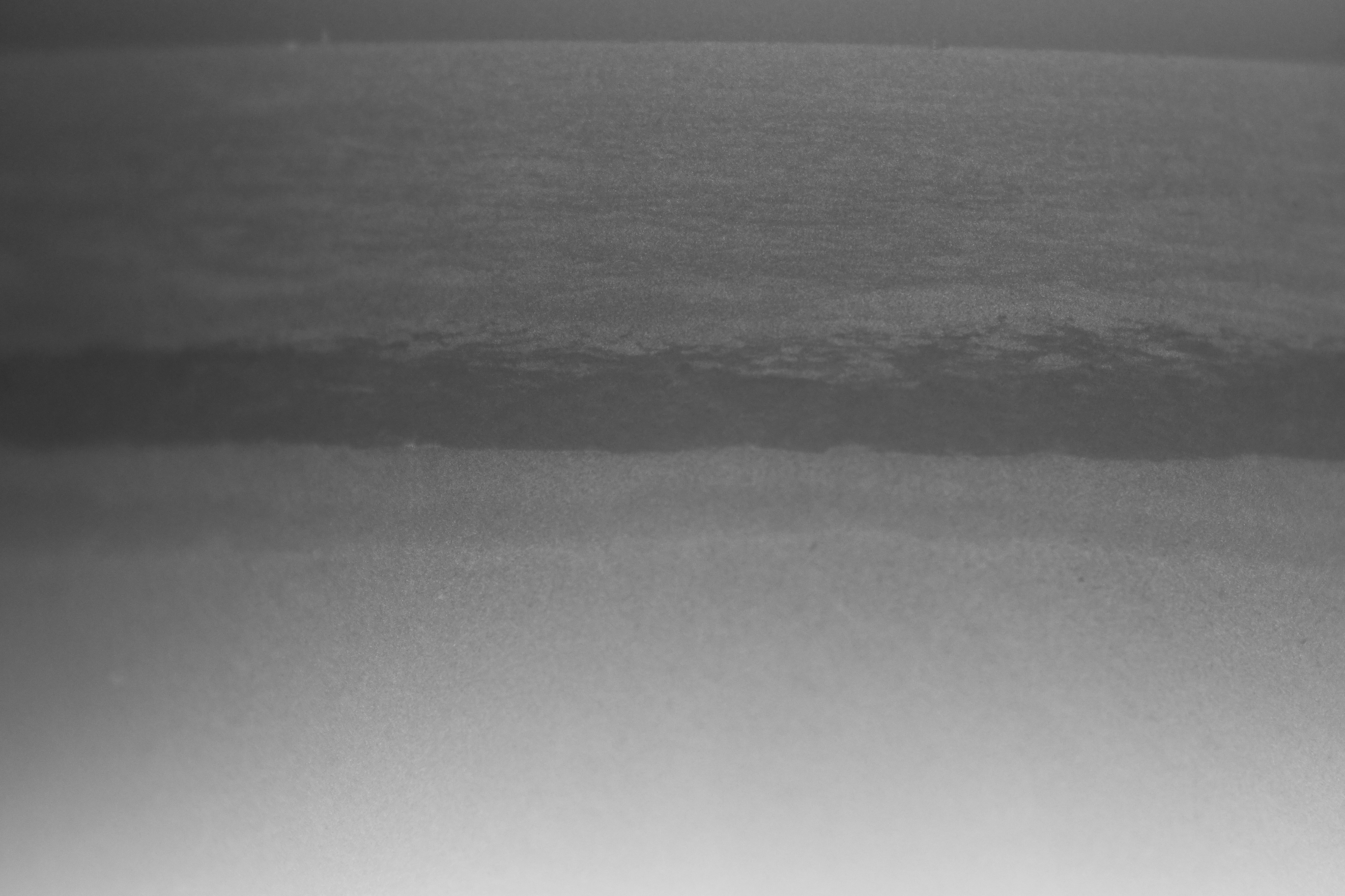 Ces images mêlent détails marins et formations nuageuses, et pourtant, tels ne sont pas le sujet exact de ce travail : les clichés ne représentent pas directement des paysages, mais les négatifs photographiques sur lesquels ils se trouvent, suspendus face à une lumière artificielle, et capturés avec un objectif macro. Ainsi, ciel et mer se devinent à travers des valeurs lumineuses inversées, un grain prononcé ou encore des lignes d’horizon courbées par les mouvements du support celluloïd.