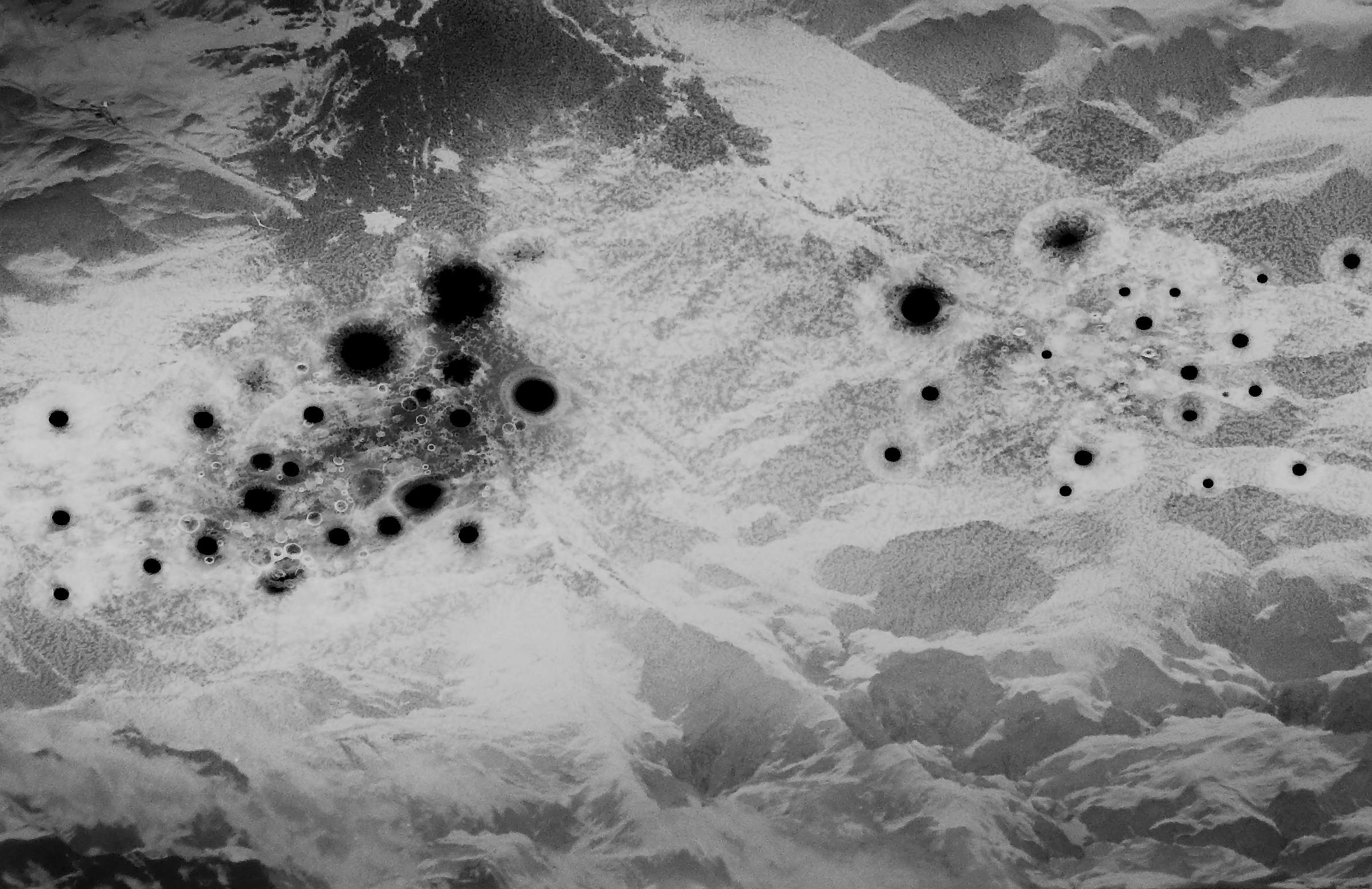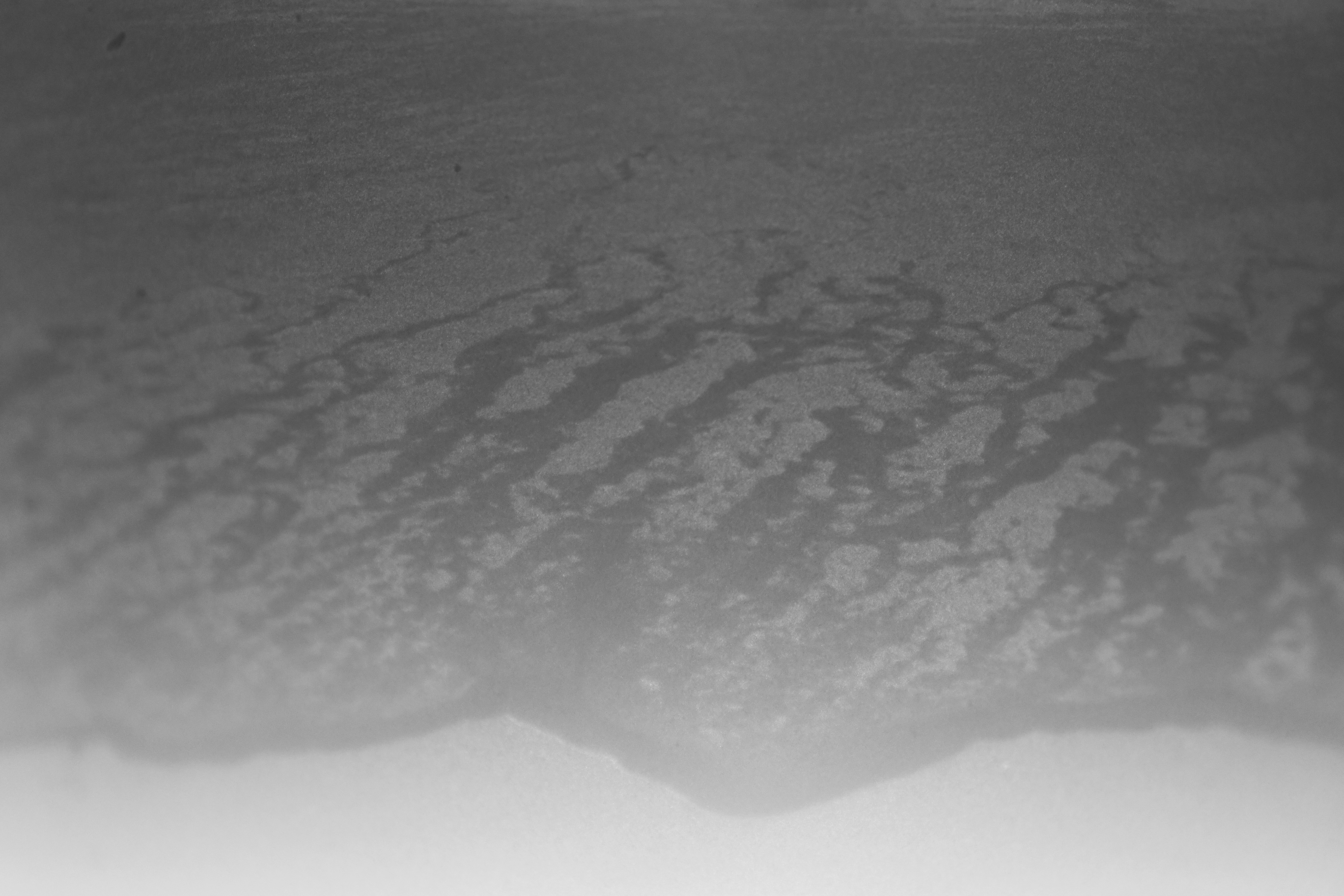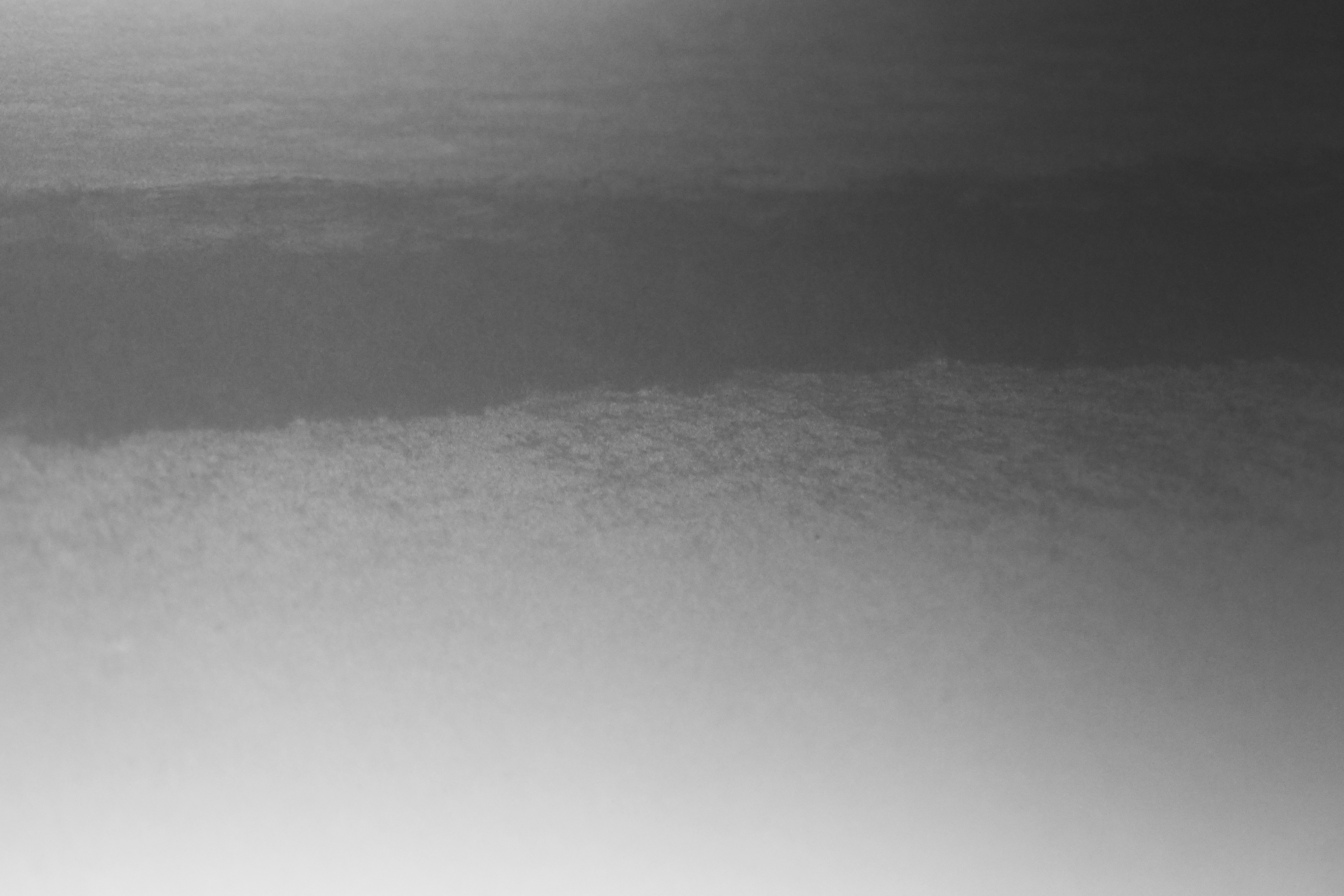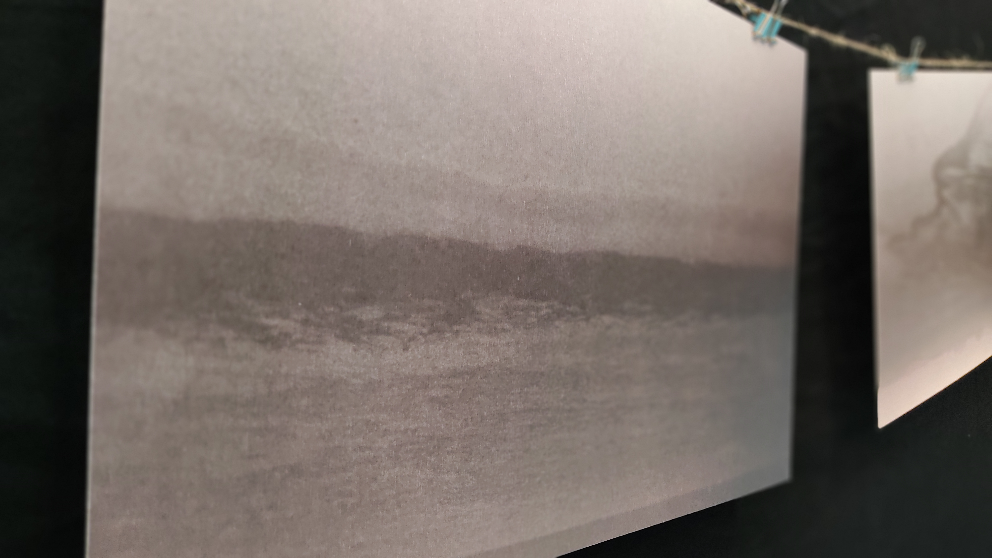 Ces images mêlent détails marins et formations nuageuses, et pourtant, tels ne sont pas le sujet exact de ce travail : les clichés ne représentent pas directement des paysages, mais les négatifs photographiques sur lesquels ils se trouvent, suspendus face à une lumière artificielle, et capturés avec un objectif macro. Ainsi, ciel et mer se devinent à travers des valeurs lumineuses inversées, un grain prononcé ou encore des lignes d’horizon courbées par les mouvements du support celluloïd.