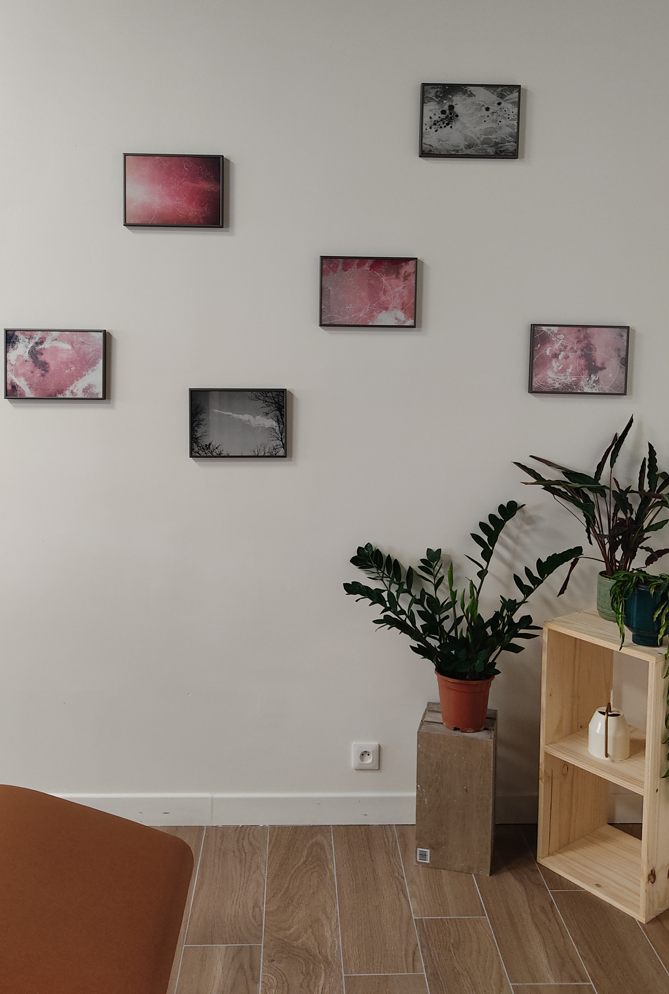 Accrochage d’un ensemble de photographies présentant un travail effectué directement sur les négatifs, par l’ajout de matières telles que des cheveux, du coton ou encore du vernis à ongles, faisant écho aux prestations esthétiques effectuées dans le salon.